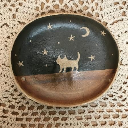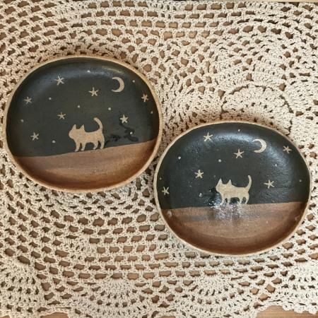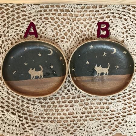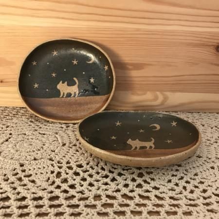 陶芸家 【泰木窯】出月 泰子 2003年飯能市赤沢に築窯 猫を中心に、動物や植物をモチーフにした食器やランプなどを制作しています。 陶芸を教える傍ら、東京や埼玉など年数回の個展やグループ展などで出展活動しています。 夜空の下でたたずむ猫のシルエットがロマンチックですね♪ 小皿にお菓子やちょこっとお惣菜を乗せたり☆ アクセサリー置きにしても素敵☆ ※ひとつひとつ手創りですので、絵柄や色合い大きさなど若干違いがございますので、2点よりお選びください。 【サイズ】A:約横12.2cm×縦H10.3cm×厚み1.7cm B:約横12.4cm×縦H10.7cm×厚み1.7cm 【材質】陶器 ■作家作品のため、お箱のご用意がございません。 ギフトにされる際は、パッキンで梱包し和紙の袋にリボンを結びラッピングさせていただきます。